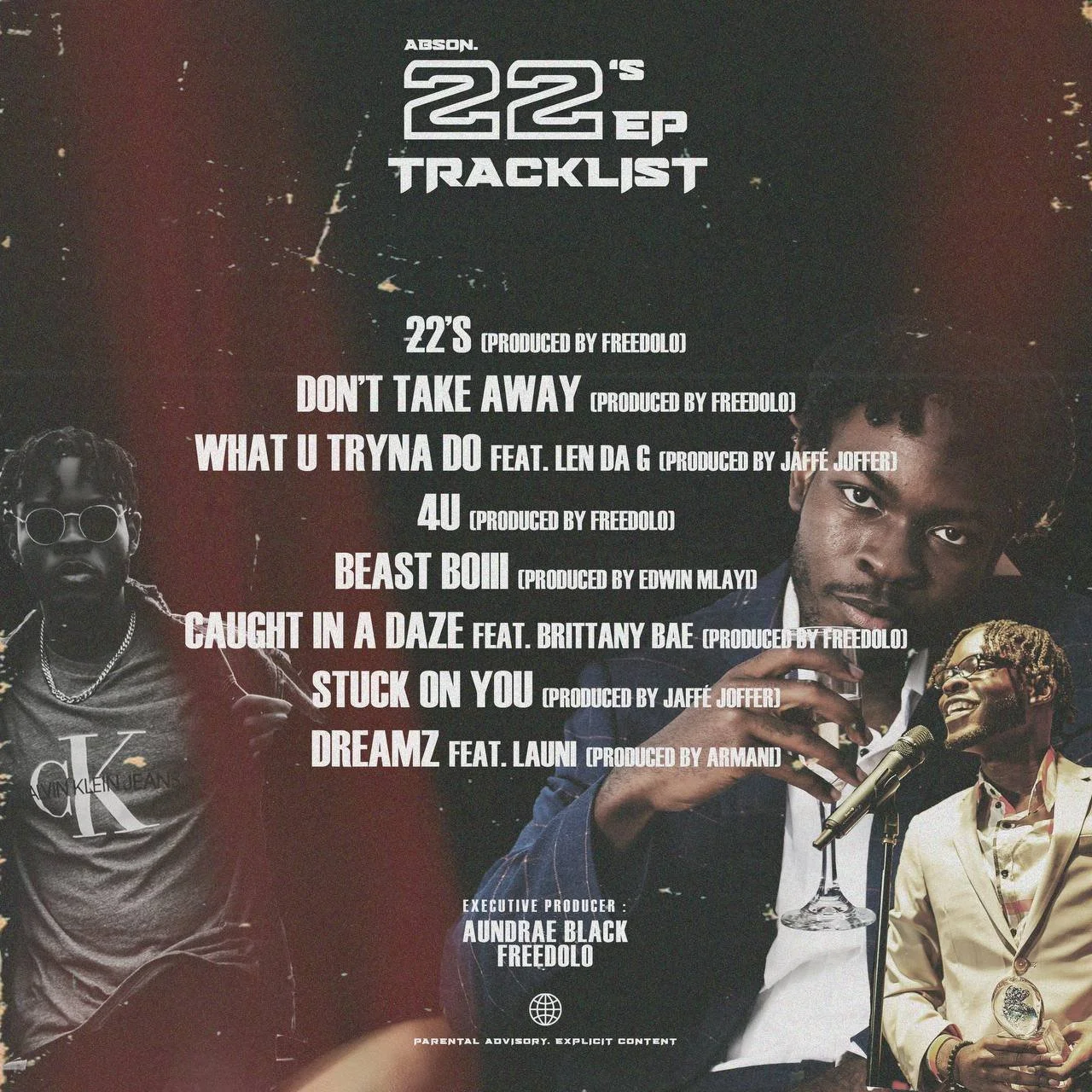 2022 proved to be another busy year for Abson. He was on several collaborations: Movin On with Nino Nyce, Slowa with Jair Cobb, and Around with King Whale just to name a few. On July 3rd, 2022, Abson. dropped the second project “22’s EP” as a continuation to his first project 21. This time, he was assisted by FREEDOLO & Aundrae Black as executive producers as well as other production Jaffé, Edwin Mlayi, Eric Sisco and Armani. The features included artists such Brittany Bae, LaUnI and Len Da G. When speaking on the project Abson. states “ I wanted to give the people a little more experimentation. Showcase what I can do with my vocal abilities and mix it with rapping and climbing ladder of versatility.” From there, Abson. dropped his latest video for his track Don’t Take Away shot by long video collaborator Myndz, gaining thousands of views. In addition, the music video for his single 4U has garnered over 50K plays within a three month span and its still growing! Abson. also made an appearance on 96.1 FM multiple times to discuss more of music, getting his award winning song Girlfriends on the radio for the 1st time on April 21st, 2022 as well as later in the year on September 1st. A plethora of performances ensued, starting with WTF to start off the new year, Shamrock in February, We Got All The Sawce in March, both My City Mondays and the O-Town Showcase. On October 14, he dropped his highly anticipated single I Need Ya with FREEDOLO which brought him to over eleven thousand streams worldwide. On November 30th, he received an award for best cover art at the Fusion awards, winning it for his project 22’s.
